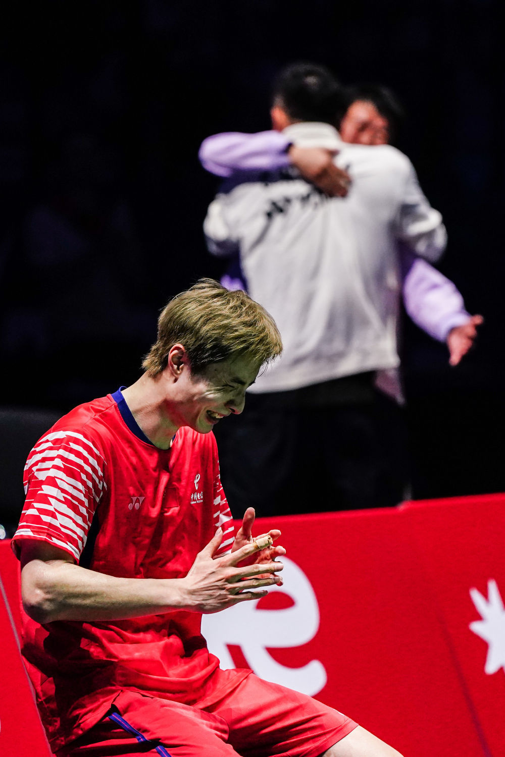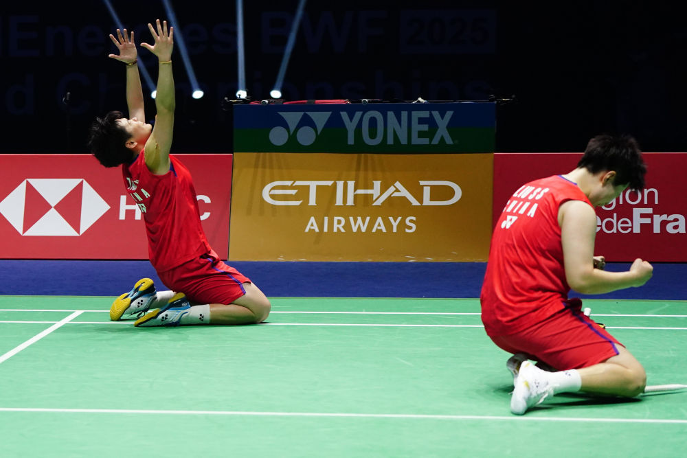 8月31日,在法国巴黎举行的2025年世界羽毛球锦标赛男子单打决赛中,中国选手石宇奇2:1战胜泰国选手昆拉武特,获得冠军。图为石宇奇在比赛后跪地而泣。新华社记者 彭子洋 摄