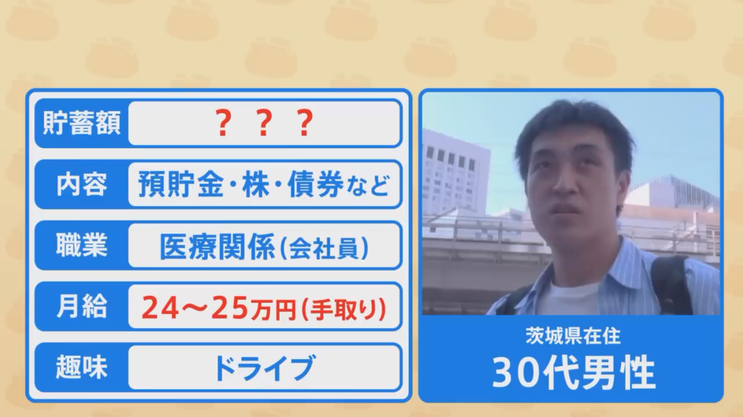 第一个受访者,是一位30多岁的男性,在医疗相关公司上班,每月到手工资大约24~25万日元(约合人民币1.1万元)。他的储蓄额是——“大概70万吧?”