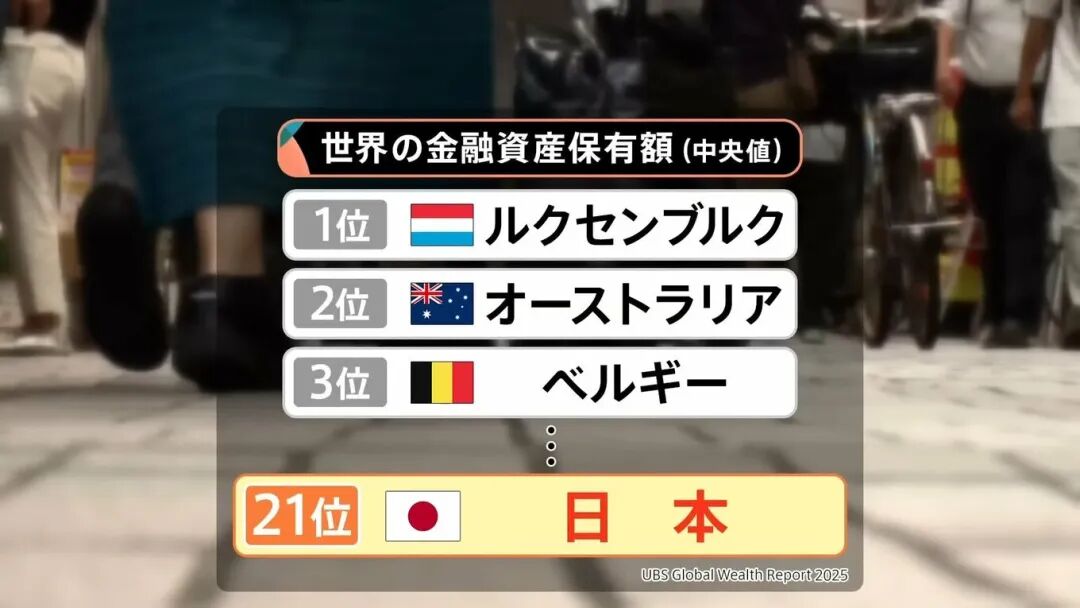 根据瑞士一家金融机构的报告,金融资产中位数排名前几的是卢森堡、澳大利亚、比利时,日本只排第21位。