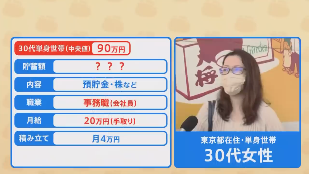 一位25岁的日本女性,从事金融相关的公司职员,月入约30万日元(约合人民币1.4万元)。她的储蓄是——现金500~600万日元(约合人民币23~28万元),加上股票200~300万日元(约合人民币9~14万元),总共900万日元左右(约合人民币42万元)日元(约合人民币42万元)。