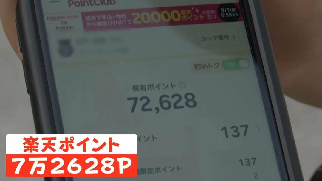 靠App每月攒下2000日元的积分,算上平时购物积分,她现在账户里光是点数就已经:乐天积分有72628点,积分21674点,加起来接近10万点。